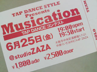 先週の金曜日 第一回タップダンスコンテスト「Musication」が無事終了しました☆ タップダンススタイルを創刊して約1年。 この春にようやく関西を飛び出したばかりの編集部が 今度はいきなり、タップダンスのコンテスト!! 一体どれだけのエントリーがあり、どれだけのお客様が来てくださるのだろう。。 そんなスタッフの不安をよそに エントリー数はソロ12名、チーム4組と見ごたえ十分な数に!! そして、当日にはたくさんのお客様が会場にお越しくださいました。 イベントを一緒に盛り上げてくださったみなさん!!! 本当にありがとうございました!! 現在編集部には、コンテストの感想が少しずつ届いています。 みなさんもご意見・ご感想を是非、編集部(tapdancestyle@yahoo.co.jp)までお送りください☆ 第二回開催に向けて更に盛り上がっていきますので、よろしくお願いします!!