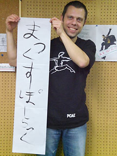 レッスン後は年末が近かった事もあり、日本の「書き初め」を逆体験!!見事な筆運びを披露してくれた!初めてにして、出来栄えもMAX!!